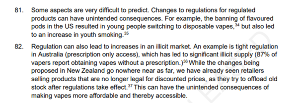 It later warns that the broader prohibition “may reduce the appeal to use vapes in smoking cessation” and that “any decrease in switching to vaping may see an increase in poor health outcomes for those who continue or return to smoking.” It also warns that some other unintended consequences can be difficult to foresee, giving the example of a ban on flavoured pods in the US resulting in youths switching to disposable vapes and to increases in youth smoking.